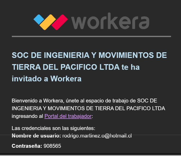 1 - En su Correo PERSONAL recibirá un Correo desde la Plataforma Workera con las credenciales de Inicio de Sesión :